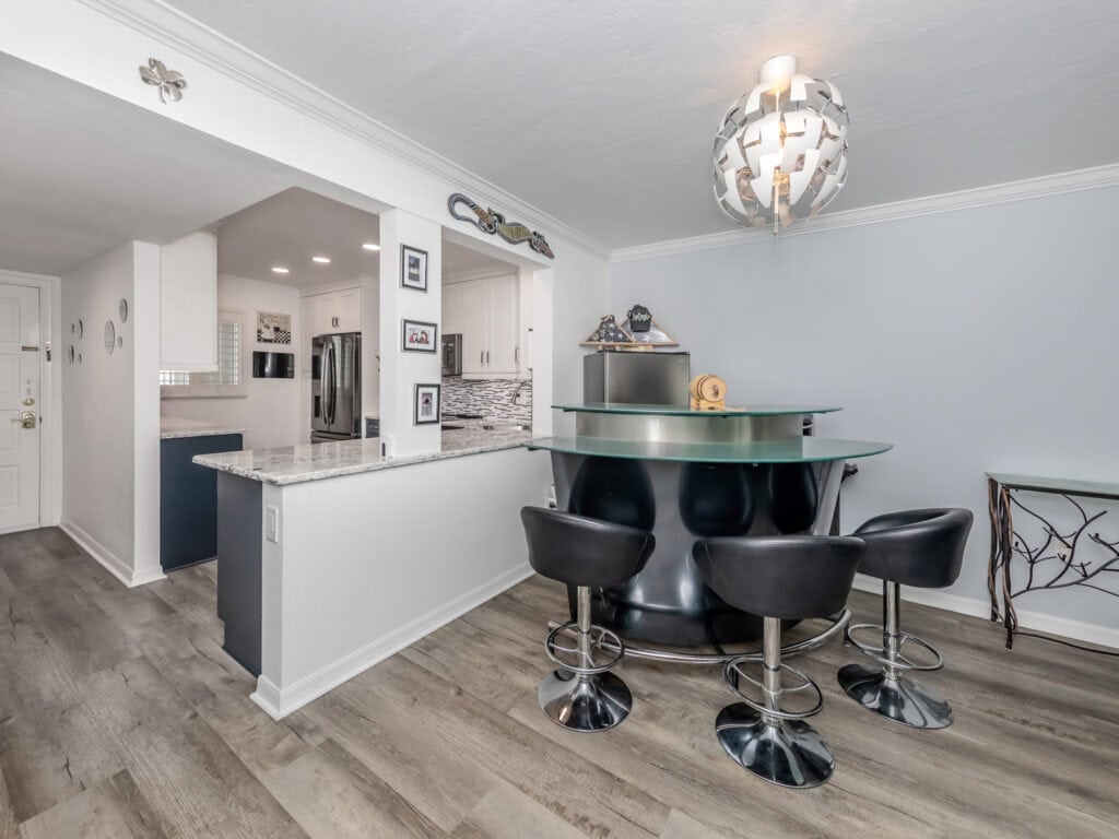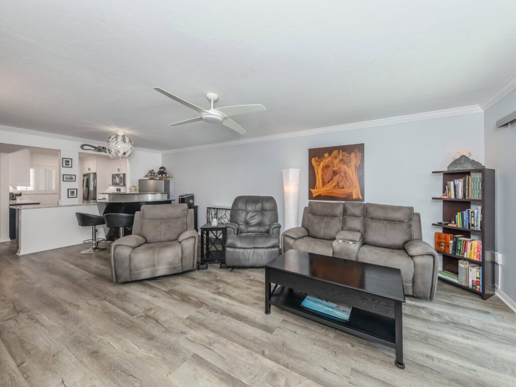 This charming 2-bedroom, 2-bathroom condominium embodies the essence of coastal living. Located in the Bella Costa Community by the Venice Intracoastal Waterway, this island condo is conveniently near downtown shops, restaurants, and local activities. With just over 1,000 square feet of living space, this unit features sleek laminate flooring, with carpeting in both bedrooms. The main bedroom includes a walk-in closet and an en-suite bathroom. The guest bedroom also has a walk-in closet and a private en-suite bathroom. Additionally, this unit comes with a designated carport spot and a storage closet. The building is equipped with an elevator for easy access. Please note that pets are not allowed in the community.